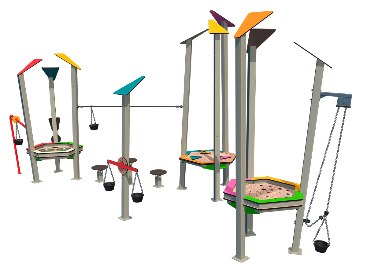 Este combinado de arena 1 o AAI-05 es un conjunto compuesto por varias estaciones de juego independientes, organizadas a baja altura y conectadas visualmente entre sí. El conjunto incluye tres plataformas principales de trabajo con arena, diseñadas con espacio libre inferior que permite el acceso de usuarios en silla de ruedas. Cada estación incorpora distintos elementos manipulativos vinculados al juego con arena, distribuidos de forma perimetral para facilitar su uso desde diferentes posiciones. El diseño abierto del conjunto favorece la circulación alrededor de las plataformas y el uso simultáneo por varios usuarios. La estructura se apoya sobre pies verticales metálicos divergentes, garantizando estabilidad y resistencia para su instalación en exteriores. Los materiales están pensados para soportar un uso continuado, con acabados seguros y bordes redondeados, adecuados para el uso infantil.