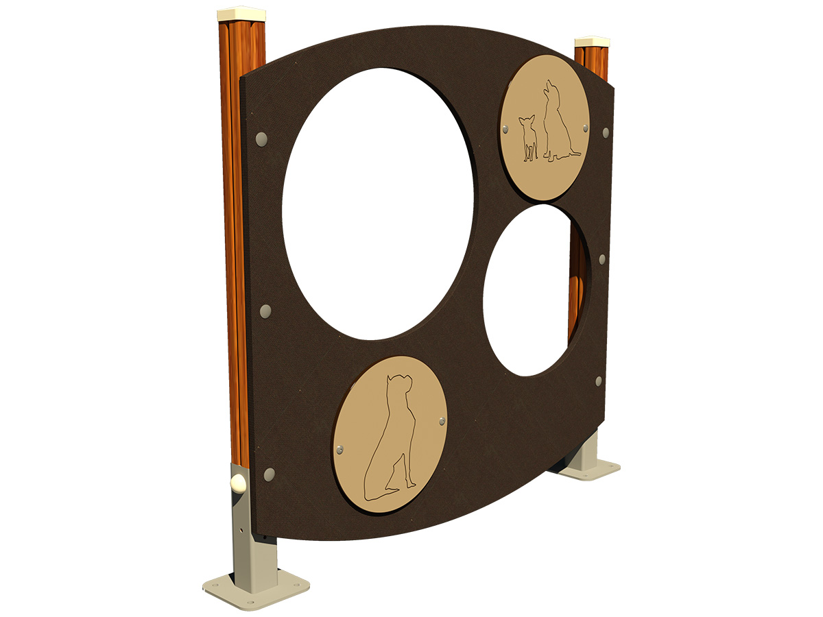 Este panel incorpora dos círculos de salto, permitiendo diferentes niveles de dificultad y favoreciendo el entrenamiento progresivo dentro de áreas caninas urbanas. Su estructura se compone de pies de soporte en madera de pino tratada para exteriores y acabado lasur a poro abierto, garantizando resistencia frente a la intemperie y durabilidad en entornos de uso intensivo.