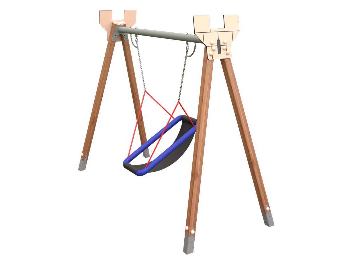 Nuestro columpio asiento integración o COL-09 está formado por una estructura de cuatro pies inclinados unidos mediante un larguero superior, diseñada para albergar un asiento tipo hamaca. Este asiento flexible y envolvente, suspendido mediante cadenas, permite una posición más recogida y estable que el asiento plano tradicional, favoreciendo un balanceo suave y controlado. Su configuración facilita una experiencia de uso cómoda y segura, adaptándose a distintos entornos lúdicos y promoviendo un movimiento fluido.