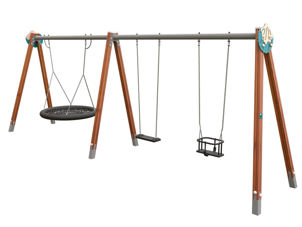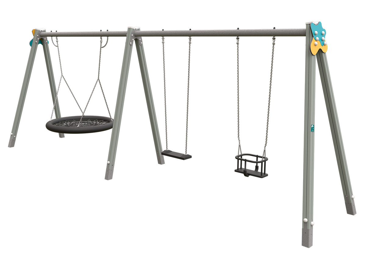 Nuestro columpio 3 asientos nido-plano-cuco o COL-19 está formado por una estructura de doble pórtico con seis pies inclinados y dos largueros horizontales. Incorpora 3 asientos diferenciados, plano, cuco y uno tipo nido, suspendidos mediante cadenas metálicas que garantizan un balanceo estable, fluido y seguro. En la parte superior incorpora caretas decorativas intercambiables disponibles en diferentes colores y formas temáticas, permitiendo su integración en diversos entornos lúdicos.