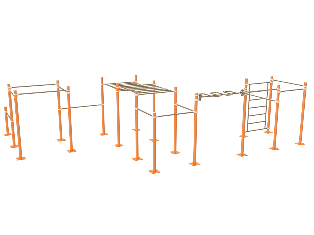 Conjunto de calistenia formado por varios elementos que permiten la realización de ejercicios de fuerza, coordinación y entrenamiento funcional. Ideal para espacios deportivos al aire libre, ofrece múltiples posibilidades de uso y se adapta a diferentes niveles de usuario.