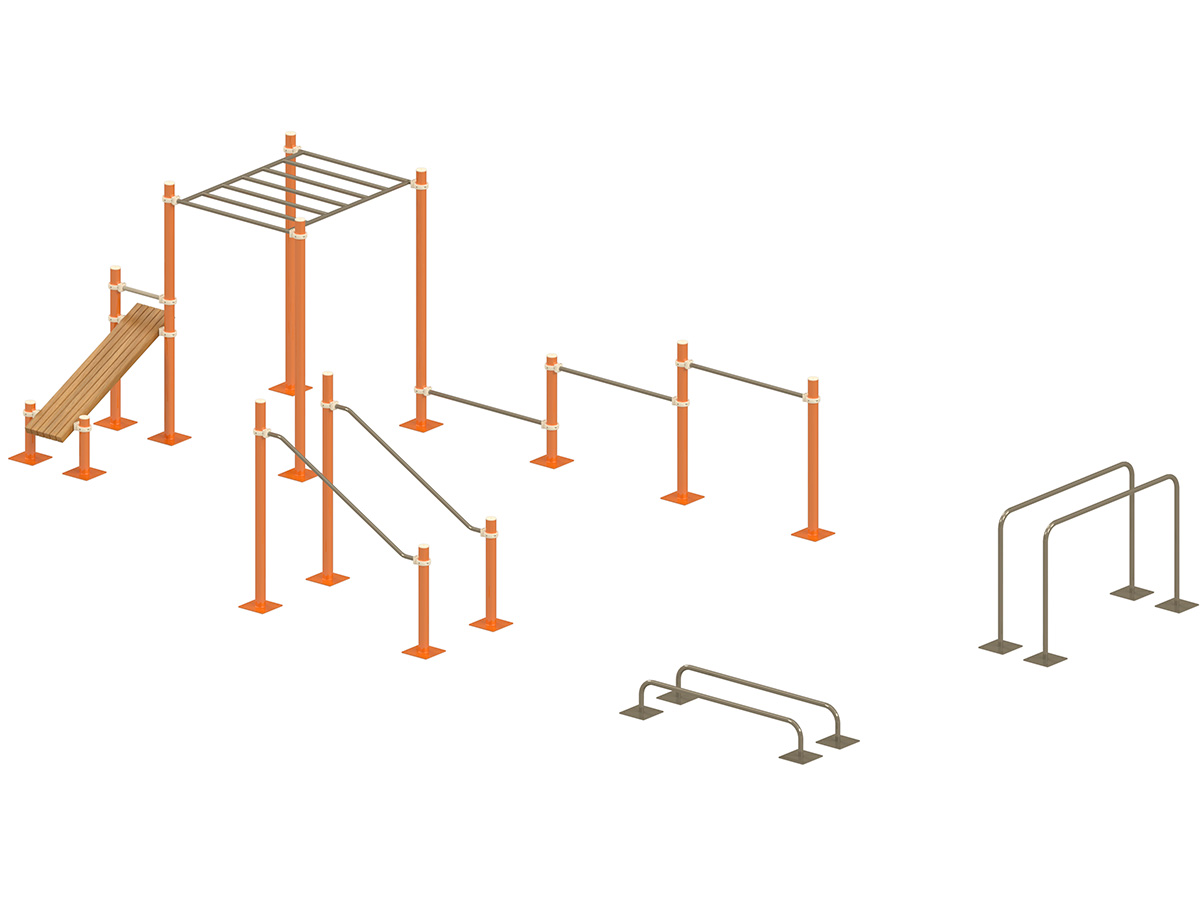 Estructura de entrenamiento al aire libre que integra varios elementos para la práctica de ejercicios de fuerza y coordinación. Diseñada para fomentar la actividad física, permite un uso flexible y adaptado a diferentes niveles.