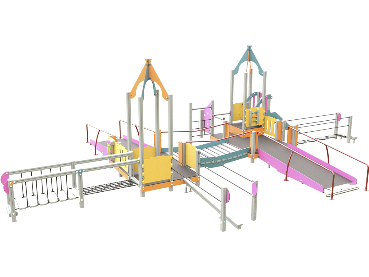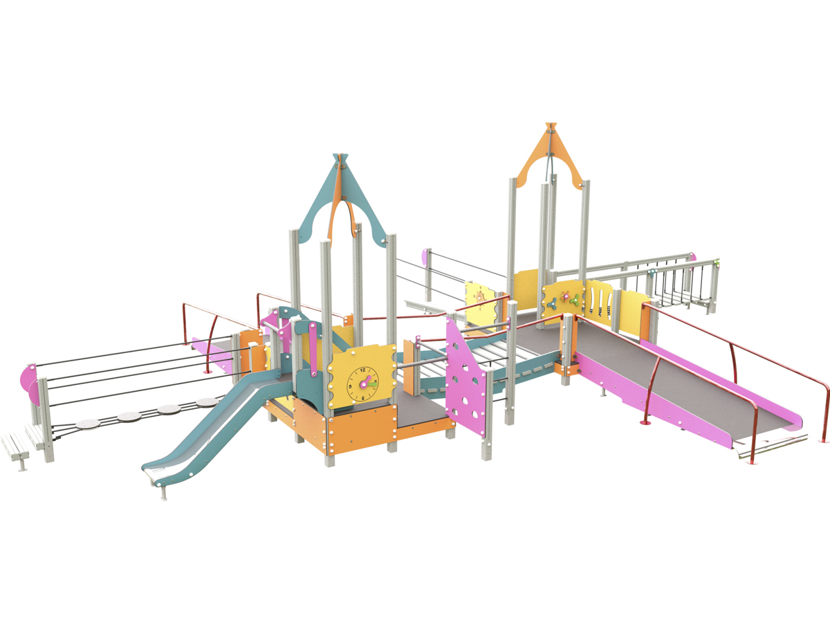 El compacto integración 3 o JCI-53 es un juego infantil de integración diseñado para el juego inclusivo y continuo a diferentes niveles, conectando varias plataformas mediante rampas accesibles, pasarelas y elementos de transición. El conjunto permite el desplazamiento fluido de usuarios con movilidad reducida gracias a recorridos sin escalones y con anchuras suficientes para el acompañamiento. Incorpora zonas de juego a baja y media altura, con paneles interactivos, elementos de equilibrio y actividades manipulativas distribuidas estratégicamente. Las barandillas y cerramientos perimetrales garantizan seguridad durante el uso, manteniendo siempre la visibilidad entre espacios. El diseño modular favorece el uso simultáneo de varios niños, promoviendo el juego compartido sin interferencias. El conjunto admite diferentes formas de acceso y circulación, facilitando múltiples itinerarios de juego.