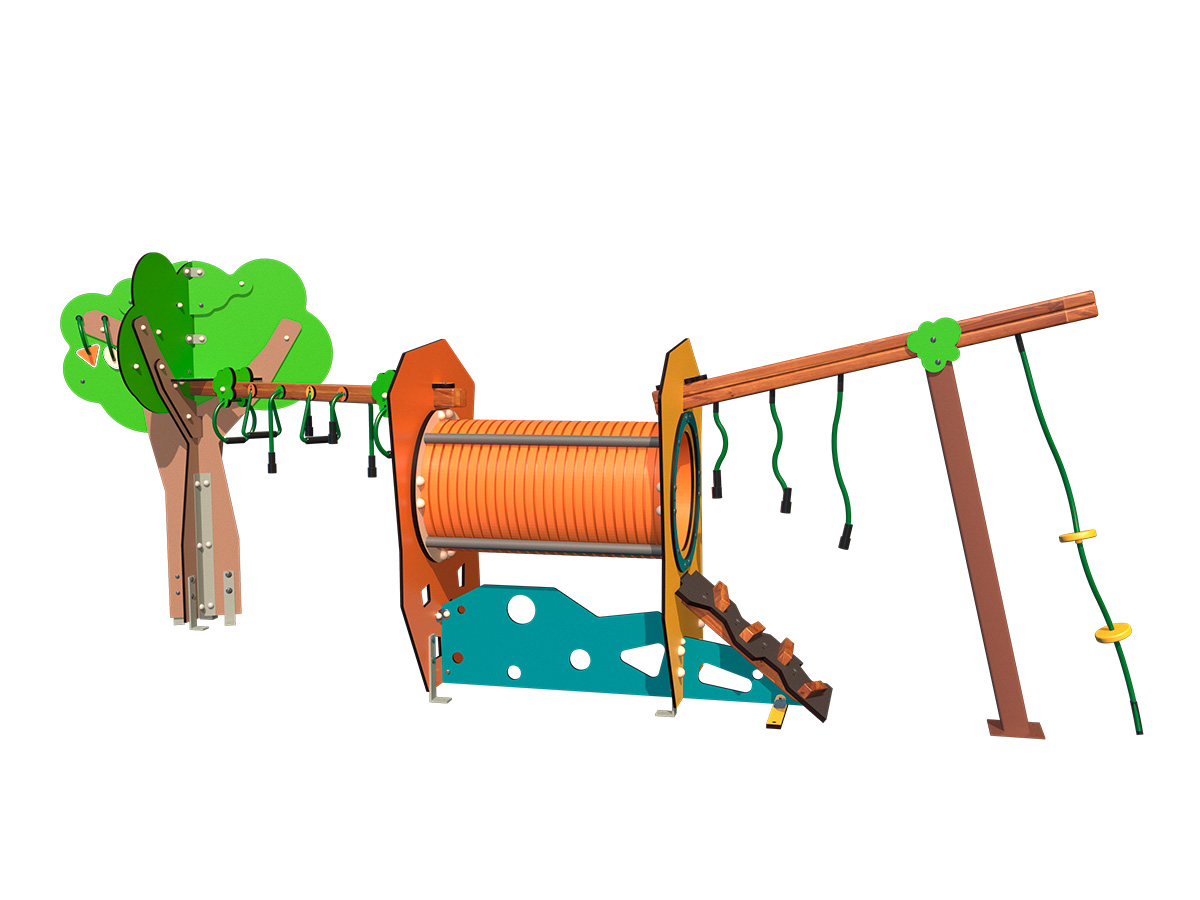 Este juego propone una experiencia motriz variada que combina gateo, trepa inclinada y suspensión de brazos, estimulando coordinación, fuerza y planificación del movimiento. El paso por el túnel favorece la percepción espacial, la orientación y la regulación sensorial al transitar por un espacio semicerrado. Las presas y asideros suspendidos fomentan la exploración progresiva del riesgo controlado y el ajuste postural. La disposición lineal del recorrido facilita la comprensión secuencial del juego, ayudando a anticipar acciones y resultados. La temática natural estimula el juego simbólico y la imaginación narrativa. Además, permite interacción entre usuarios en distintos puntos del recorrido, favoreciendo la socialización espontánea.