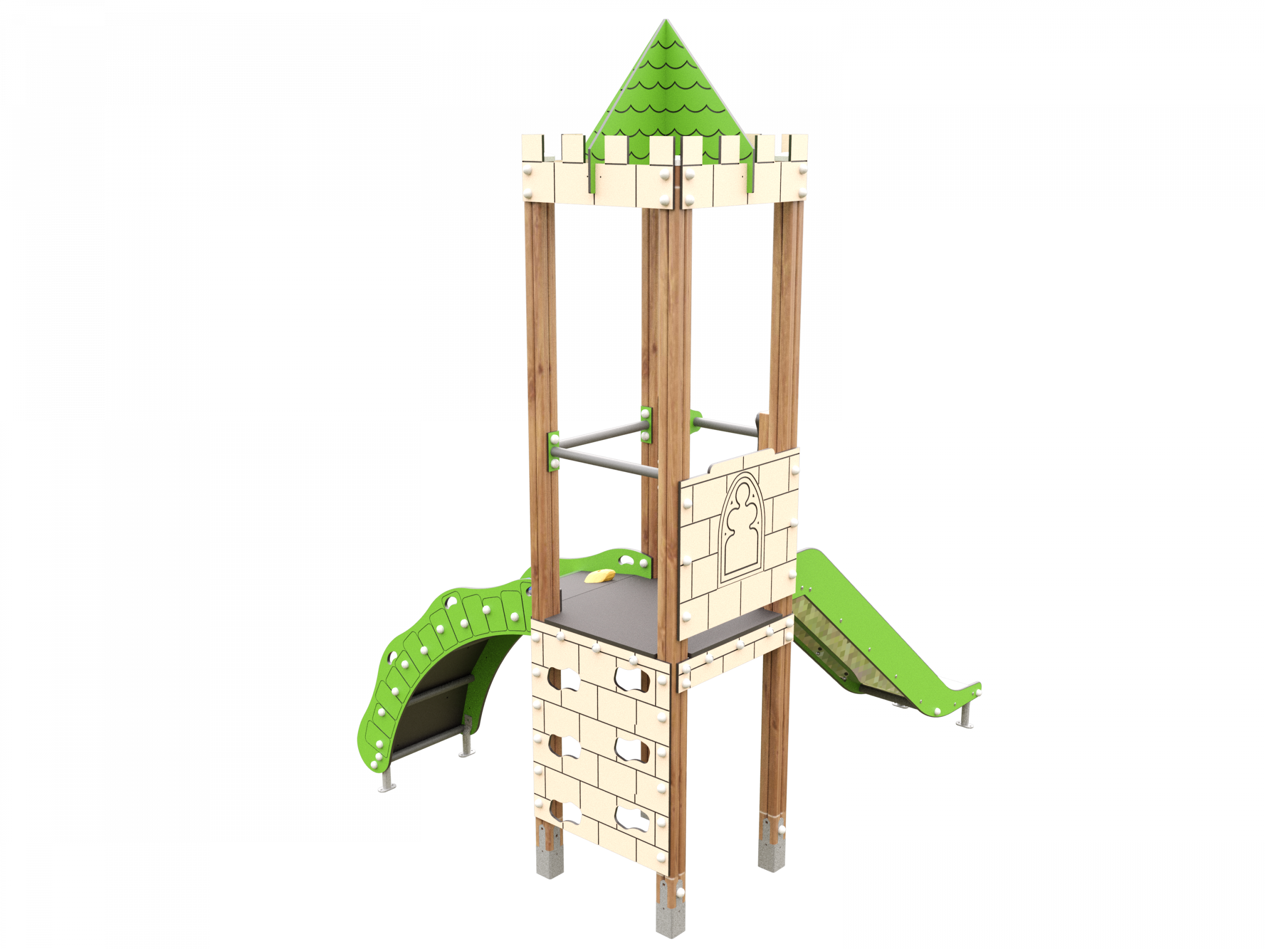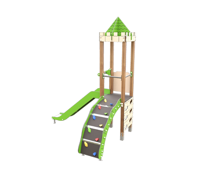 Incluye un tobogán recto de una sola pendiente, fabricado con materiales resistentes al desgaste y la intemperie. Dispone de un escalador tipo rocódromo con presas de colores, que facilita el acceso a la plataforma superior. Los paneles laterales decorativos y protectores aportan seguridad y estimulan la curiosidad del niño. La torre está sostenida por perfiles estructurales de acero o madera, garantizando estabilidad y durabilidad. El conjunto cuenta con barandillas de seguridad en la zona superior para evitar caídas.