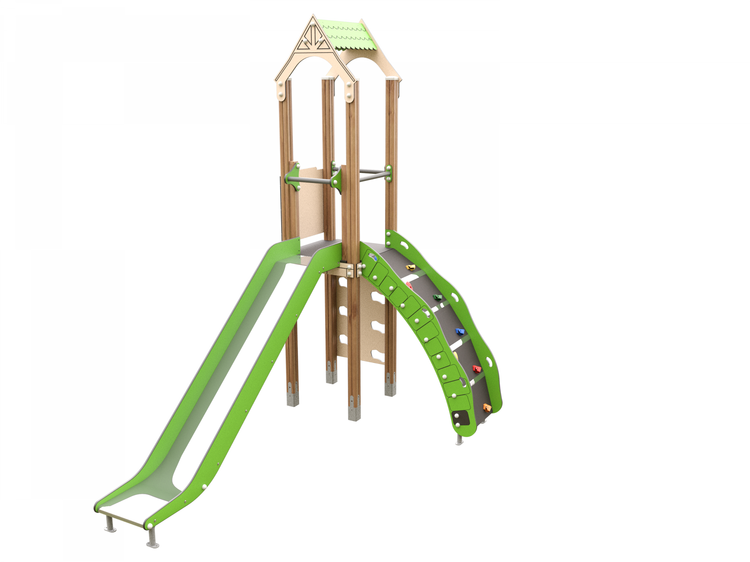 Cuenta con una plataforma elevada a la que se accede mediante un muro escalador con presas de colores, fomentando la fuerza y la coordinación. Desde la parte superior, los niños pueden descender por un tobogán recto, que estimula el equilibrio y la confianza. Los paneles laterales temáticos aportan seguridad y un componente lúdico adicional al conjunto. La estructura principal está formada por postes metálicos de alta resistencia, ofreciendo estabilidad y larga vida útil.