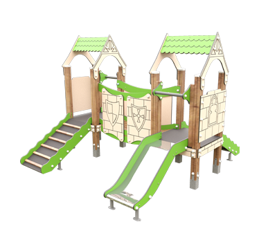 Conformada por dos torres enlazadas mediante pasarelas y paneles de juego, incorpora toboganes, escaleras de fácil acceso y zonas seguras para el juego libre. Fabricada con paneles de HPL de alta resistencia y estructura disponible en metal o madera tratada, ofrece gran durabilidad y estabilidad frente al uso intensivo y las condiciones climáticas.