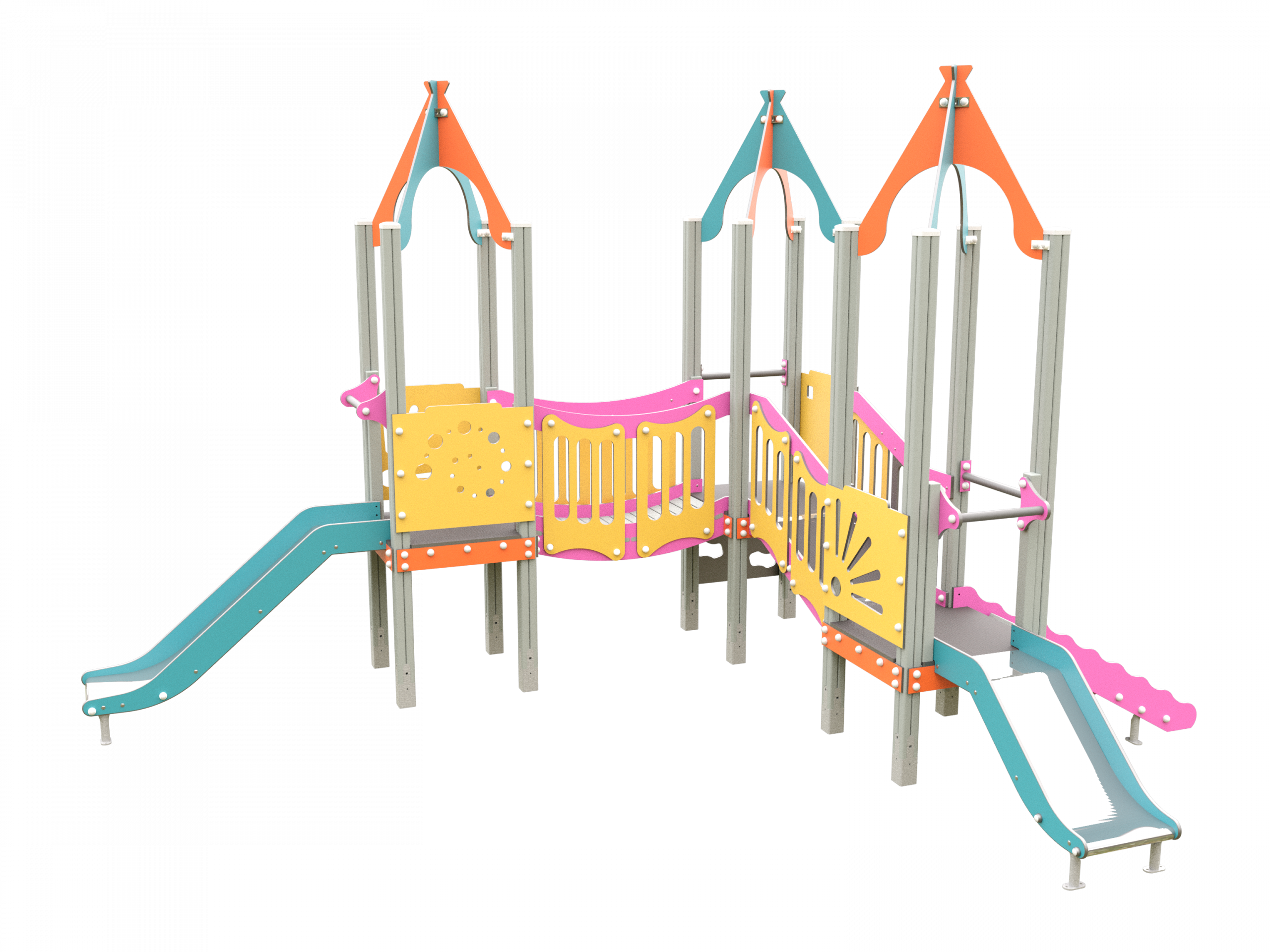 El acceso a las plataformas se realiza mediante rampas con peldaños, escaleras y paneles para escalar, favoreciendo el desarrollo motriz y la coordinación. Además, incorpora dos toboganes de salida, paneles de juego con formas y recorridos visuales, y zonas de paso protegidas con barandillas.