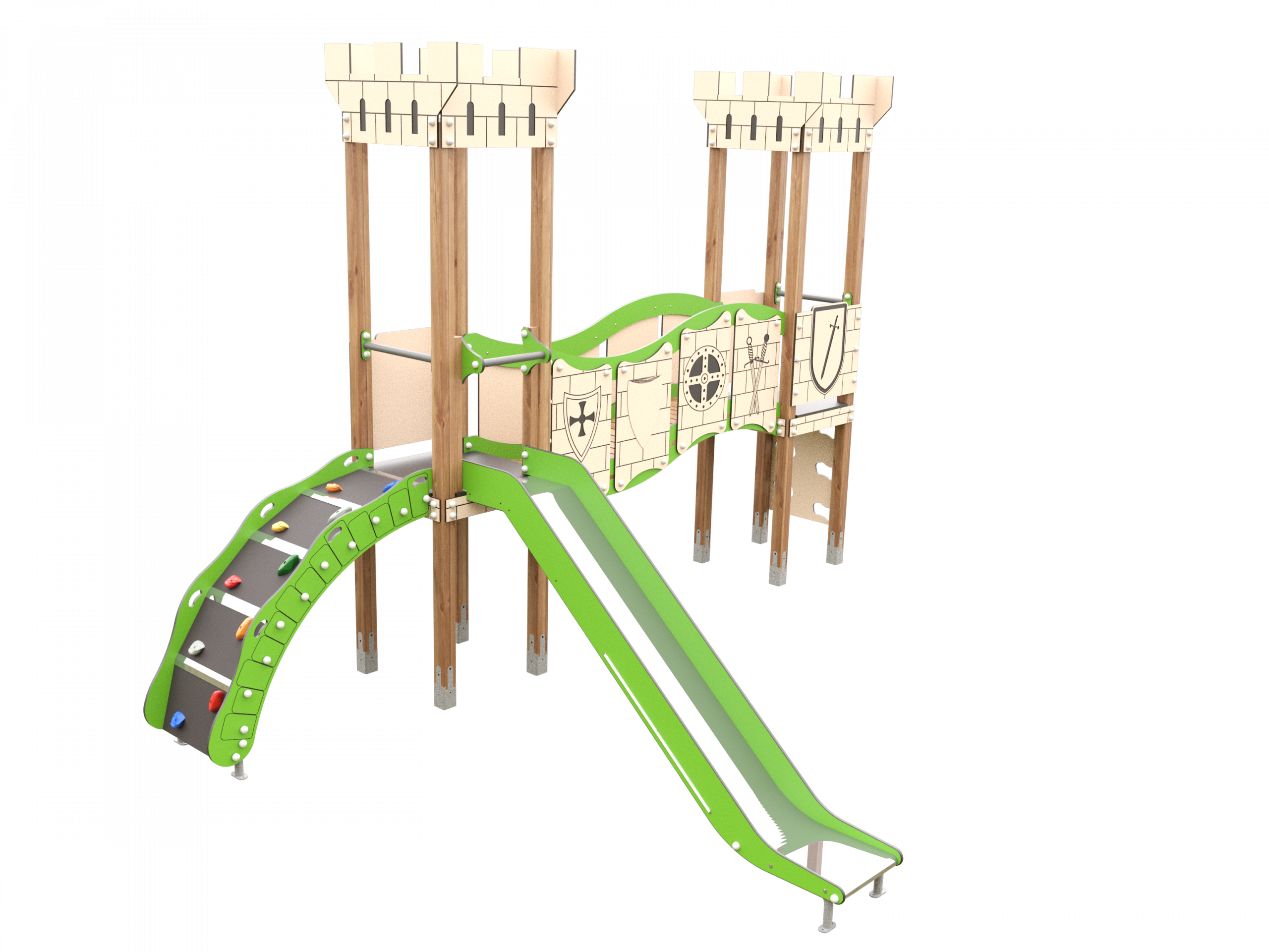 El acceso al juego puede realizarse mediante diferentes itinerarios: una rampa con agarres para escalar, peldaños inclinados y una pequeña escalera vertical. Desde una de las plataformas nace un tobogán de descenso recto, mientras que la otra torre incorpora un panel lúdico o de observación.
