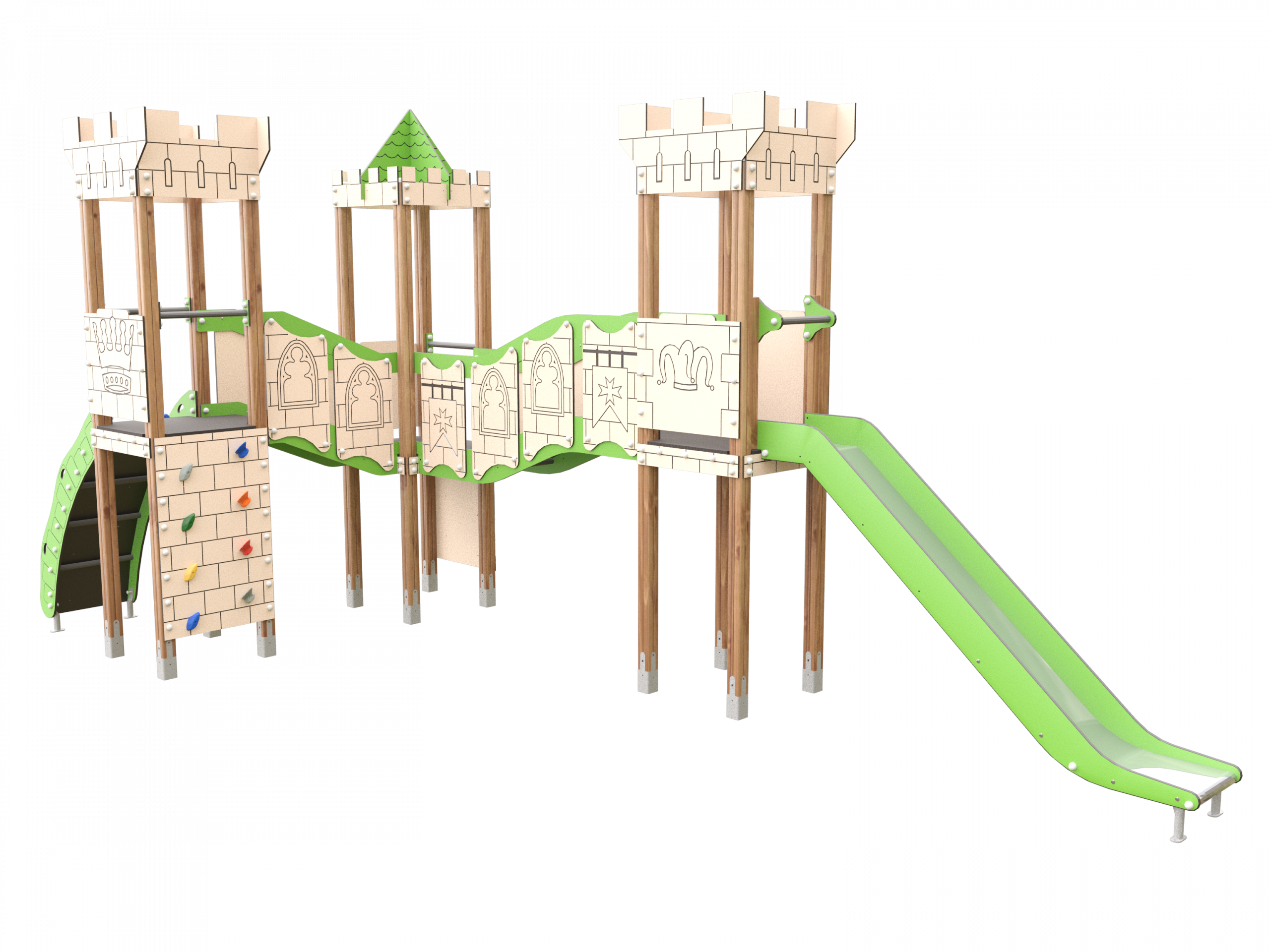 El acceso puede realizarse mediante escalera con peldaños, panel de escalada con presas y muro para escalar con huecos, ofreciendo distintas opciones de esfuerzo físico y coordinación. Incluye dos toboganes rectos para el descenso, ubicados en las plataformas principales, lo que favorece el juego dinámico y repetitivo. Los paneles laterales incorporan elementos decorativos y lúdicos que estimulan la percepción visual y la imaginación.