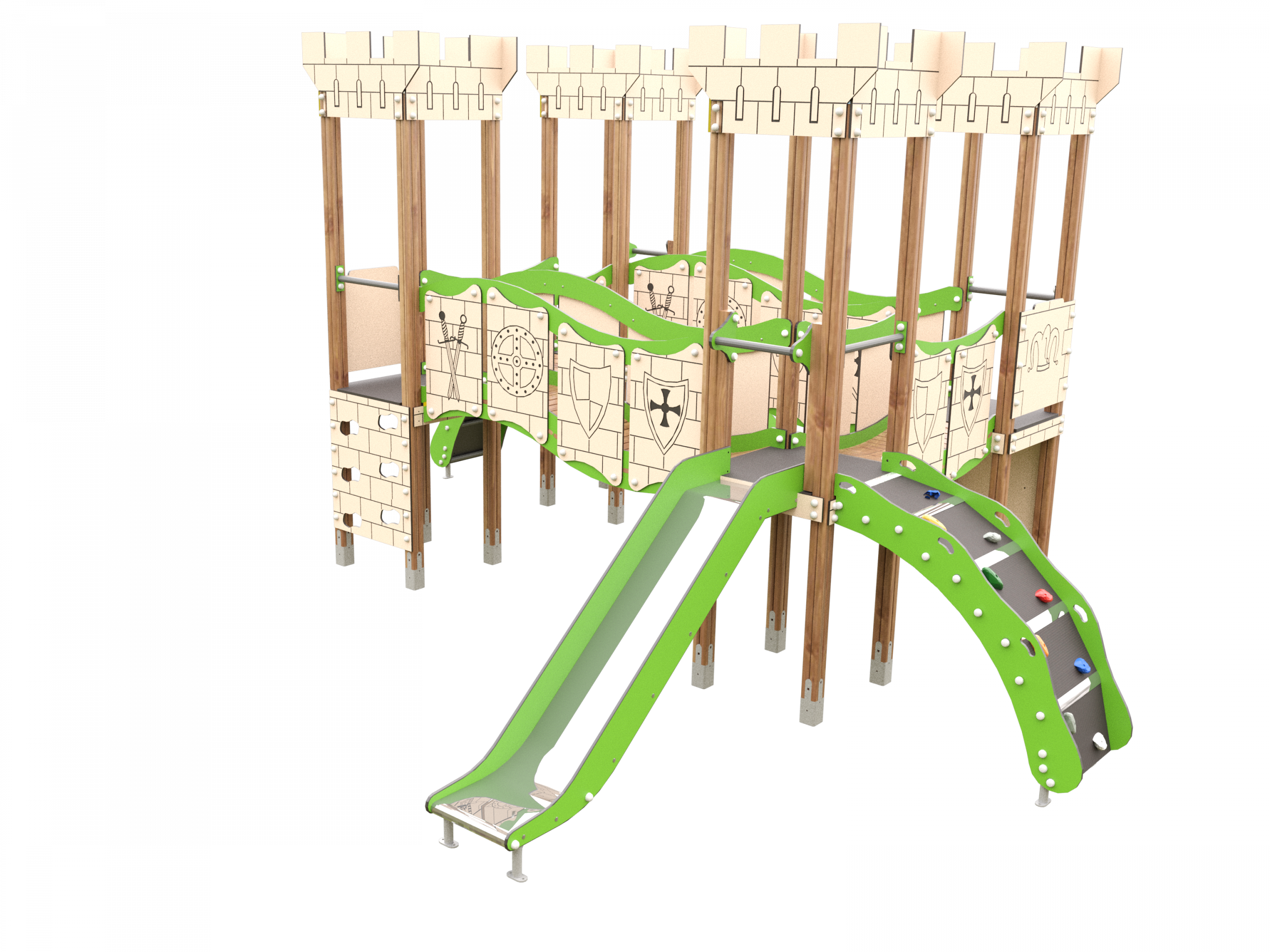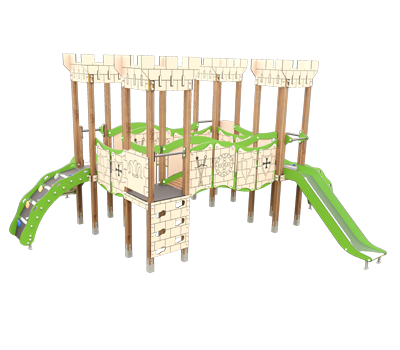 Nuestro compacto de la gama castillo, Hércules o JMC-200-14 C, es una estructura formada por tres torres comunicadas mediante pasarelas con paneles de protección de HPL y soportes en metal. Las plataformas combinan alturas de 1,20m y 1,50m , ofreciendo distintos niveles de juego.