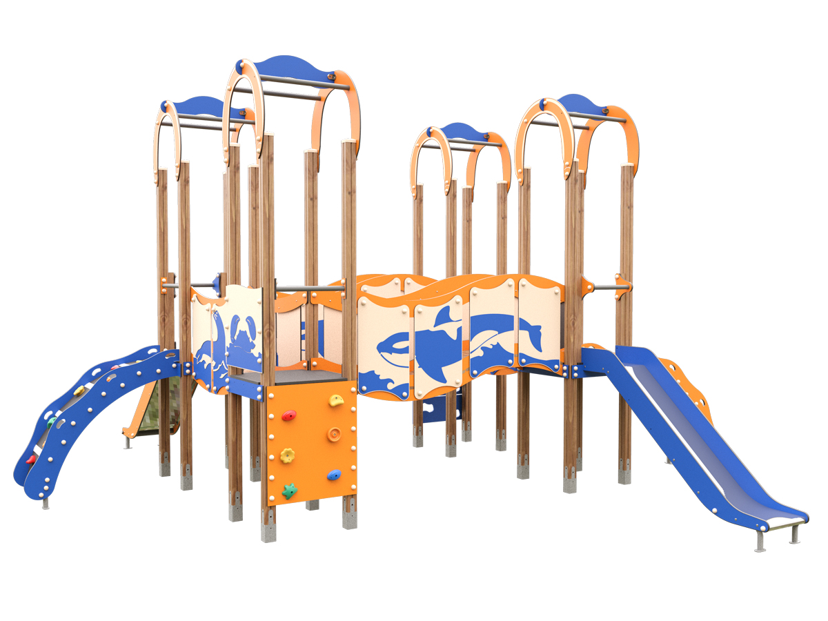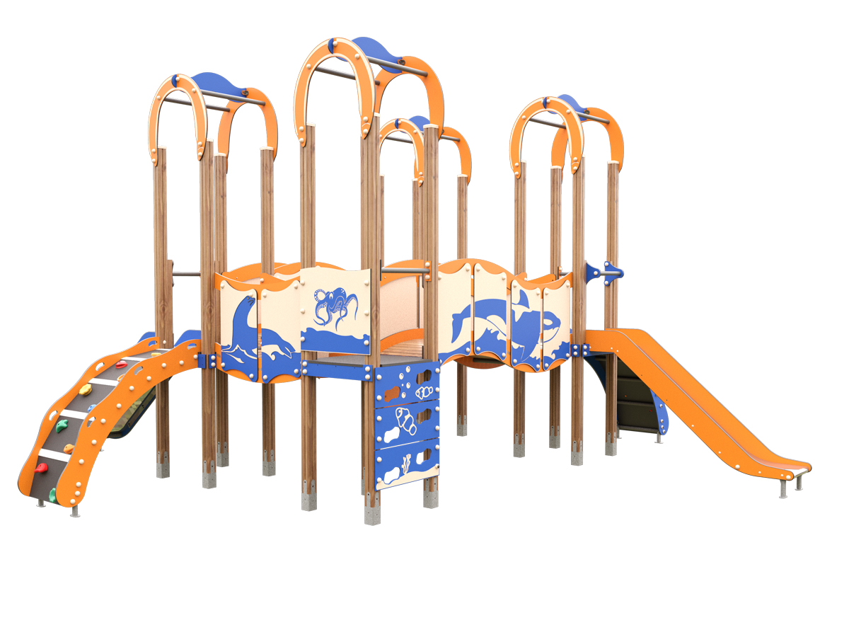 Nuestro compacto Mar Cantábrico o JMC-200-14 M, es una estructura formada por tres torres comunicadas mediante pasarelas con paneles de protección de HPL y soportes en metal. Las plataformas combinan alturas de 1,20m y 1,50m , ofreciendo distintos niveles de juego. Incluye dos toboganes, paneles interactivos y accesos mediante escaleras, arco de escalada y zonas para escalar con presas.