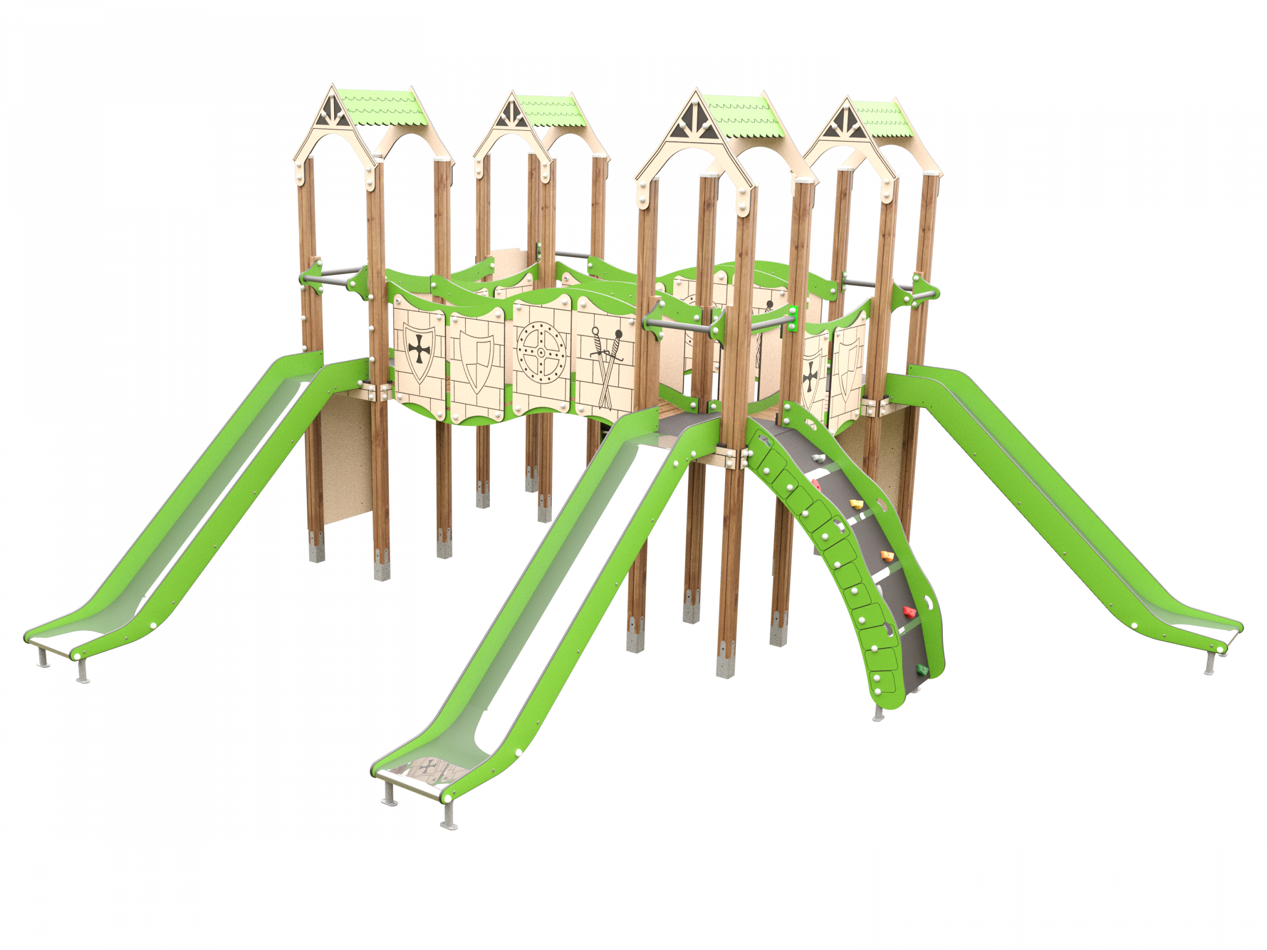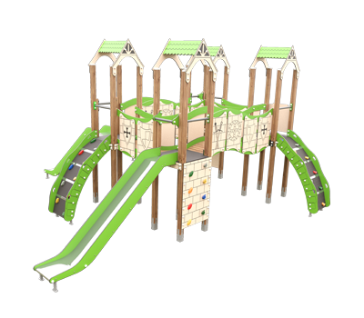 La estructura combina postes en madera tratada o metal con paneles de HPL, garantizando resistencia y estabilidad frente al uso intenso y la intemperie. Todas las plataformas cuentan con protecciones perimetrales para asegurar el tránsito seguro de los niños.