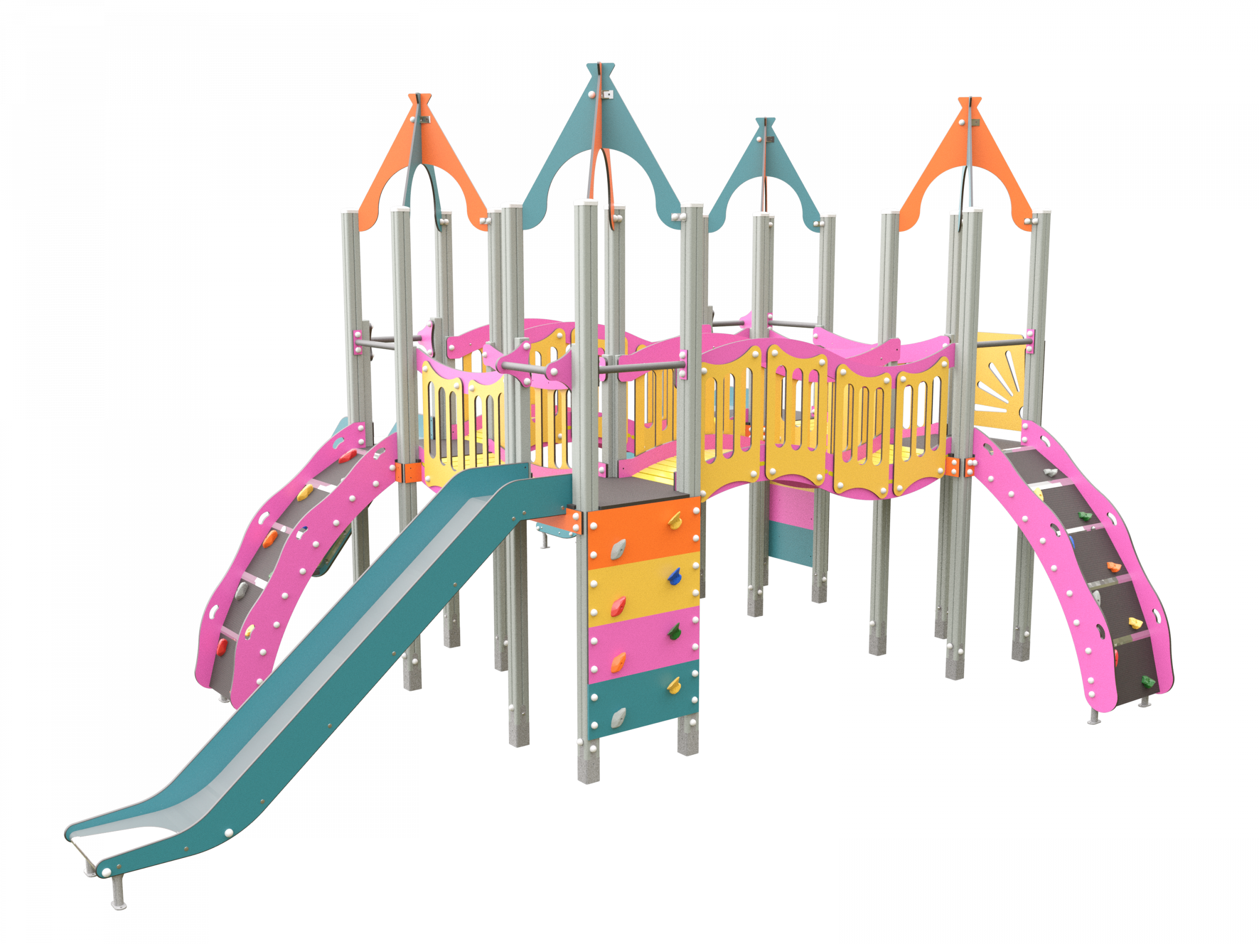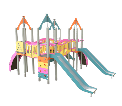 Nuestro compacto Osa Mayor o JMC-200-15 está formado por cuatro torres, todas con una plataforma a 1,50m de altura, conectadas entre sí mediante puentes y pasarelas que permiten un recorrido continuo. El acceso se realiza a través de una rampa inclinada con barandillas, así como otros elementos de subida como peldaños o trepas, que aportan diferentes niveles de esfuerzo. Una barra de bomberos ofrece una salida rápida y dinámica desde una de las plataformas, potenciando el juego activo.