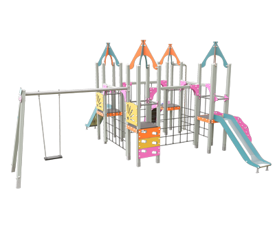 Nuestro compacto Phoenix o JMC-200-21 combina diversas actividades en una estructura de múltiples torres conectadas entre sí mediante redes verticales, puentes y plataformas intermedias. Incluye dos toboganes laterales, zonas de escalada con paneles provistos de presas y barras de sujeción que fomentan la coordinación motriz. En uno de los laterales se incorpora un columpio sencillo, lo que añade una experiencia de balanceo al conjunto sin romper la unidad visual de la