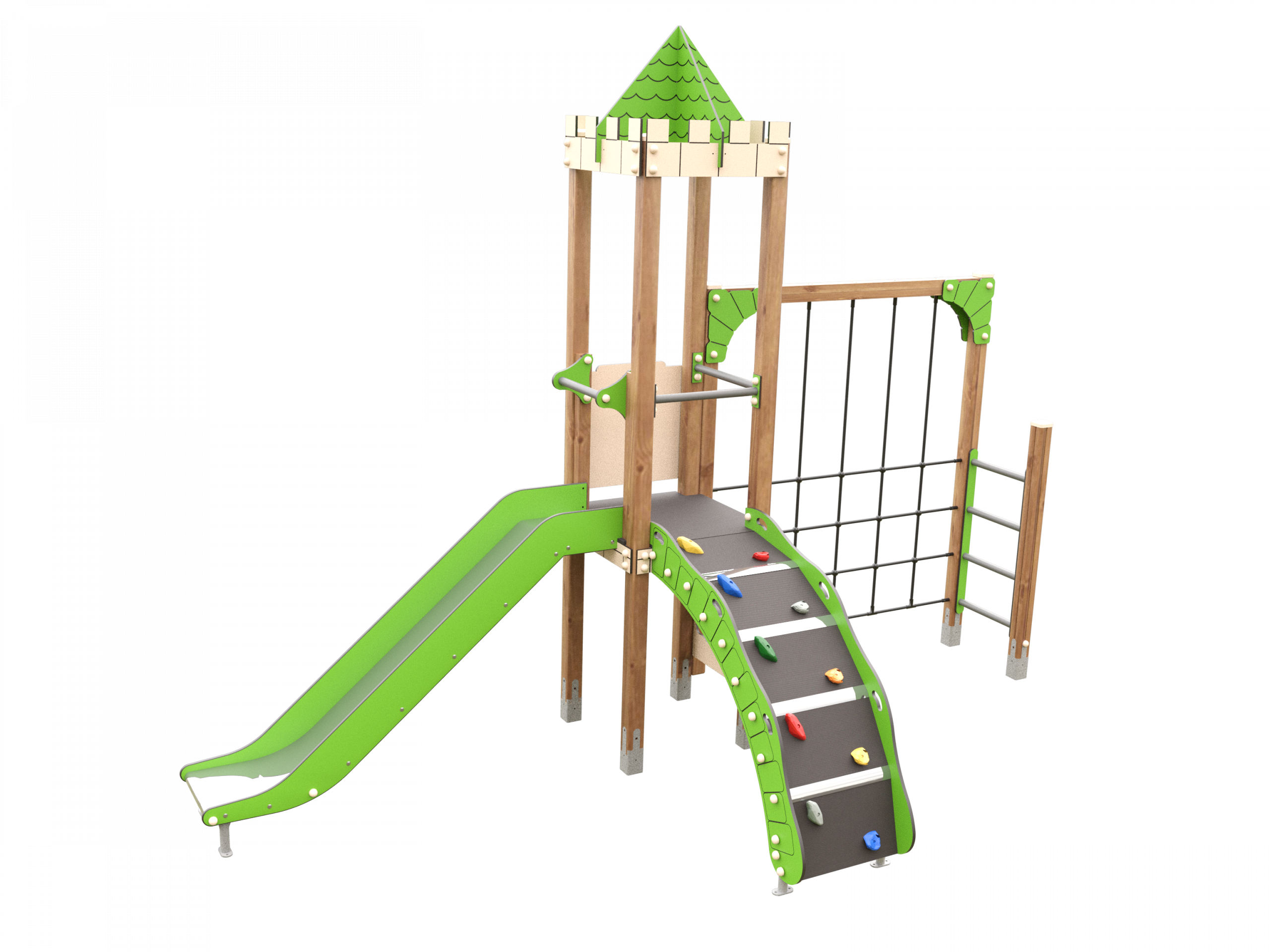 Su diseño compacto favorece el desarrollo del equilibrio, la coordinación y la orientación espacial. Las diferentes formas de acceso permiten que los niños elijan su recorrido, fomentando la autonomía y el juego activo. Los colores dle HPL aportan un atractivo visual que encaja en parques modernos y zonas infantiles públicas.