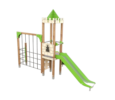Nuestro compacto Oropesa o JMC-200-26 C ofrece una estructura dinámica con una torre principal que invita a la aventura mediante escalera, panel de escalada y rampa inclinada. Desde la plataforma superior parte un tobogan que añade diversión y velocidad a la experiencia.