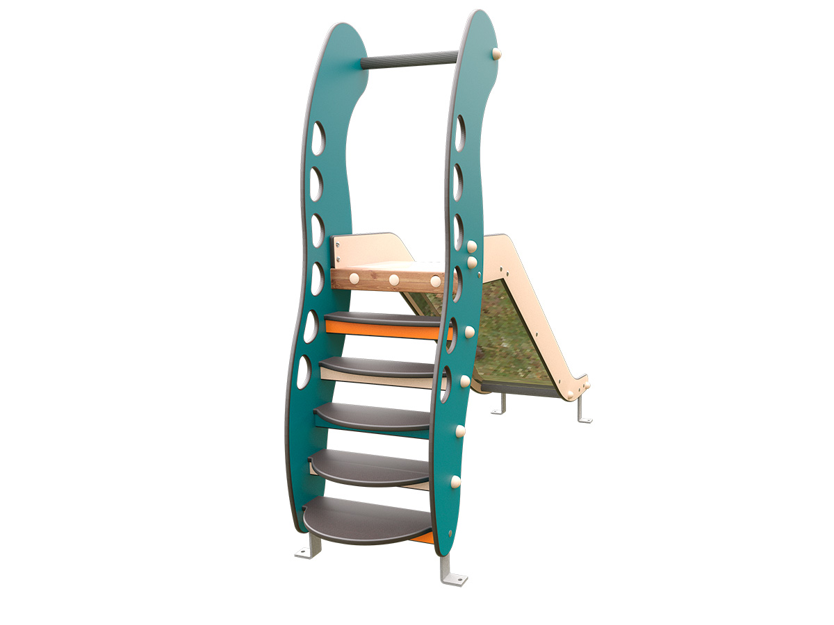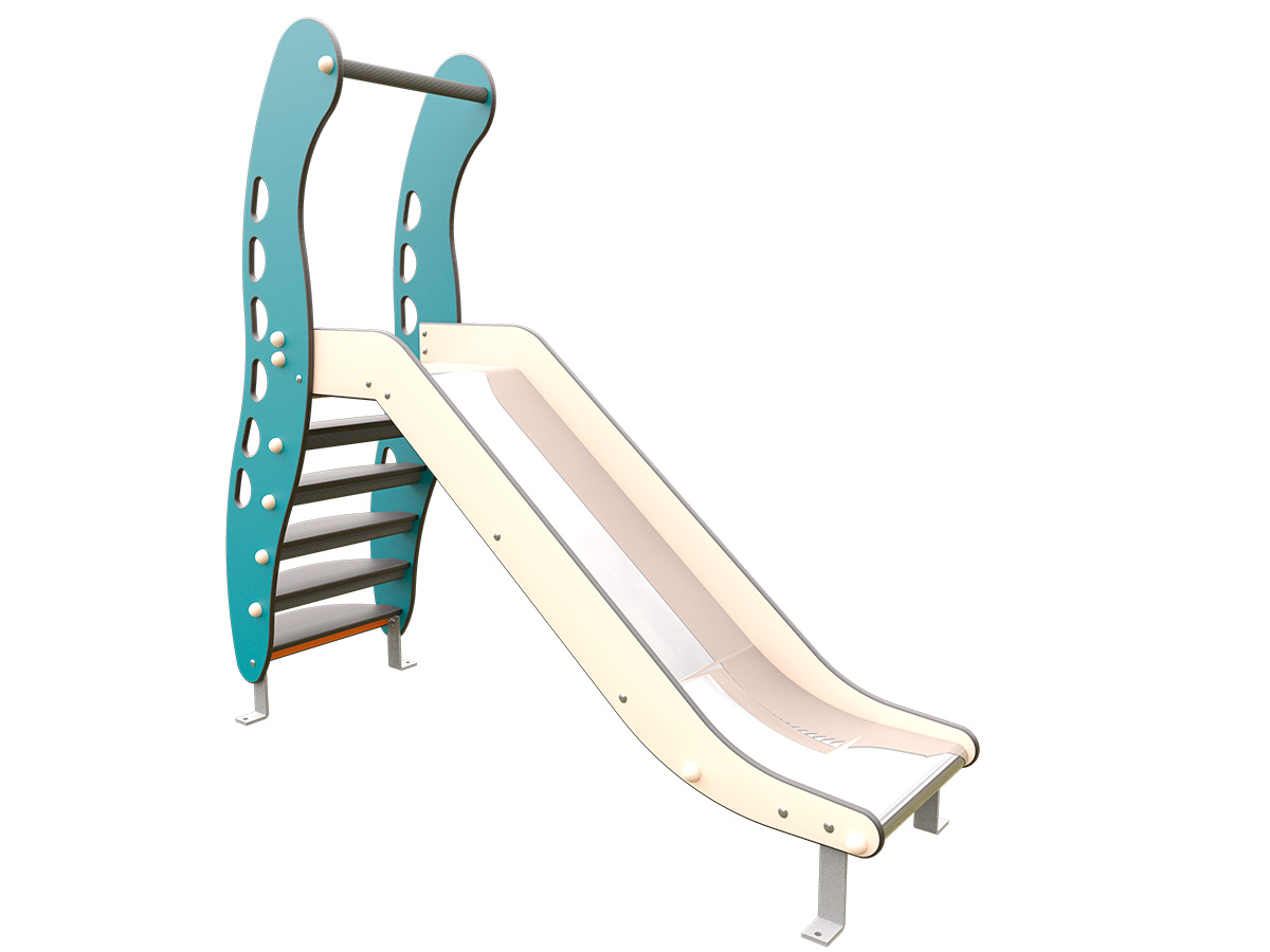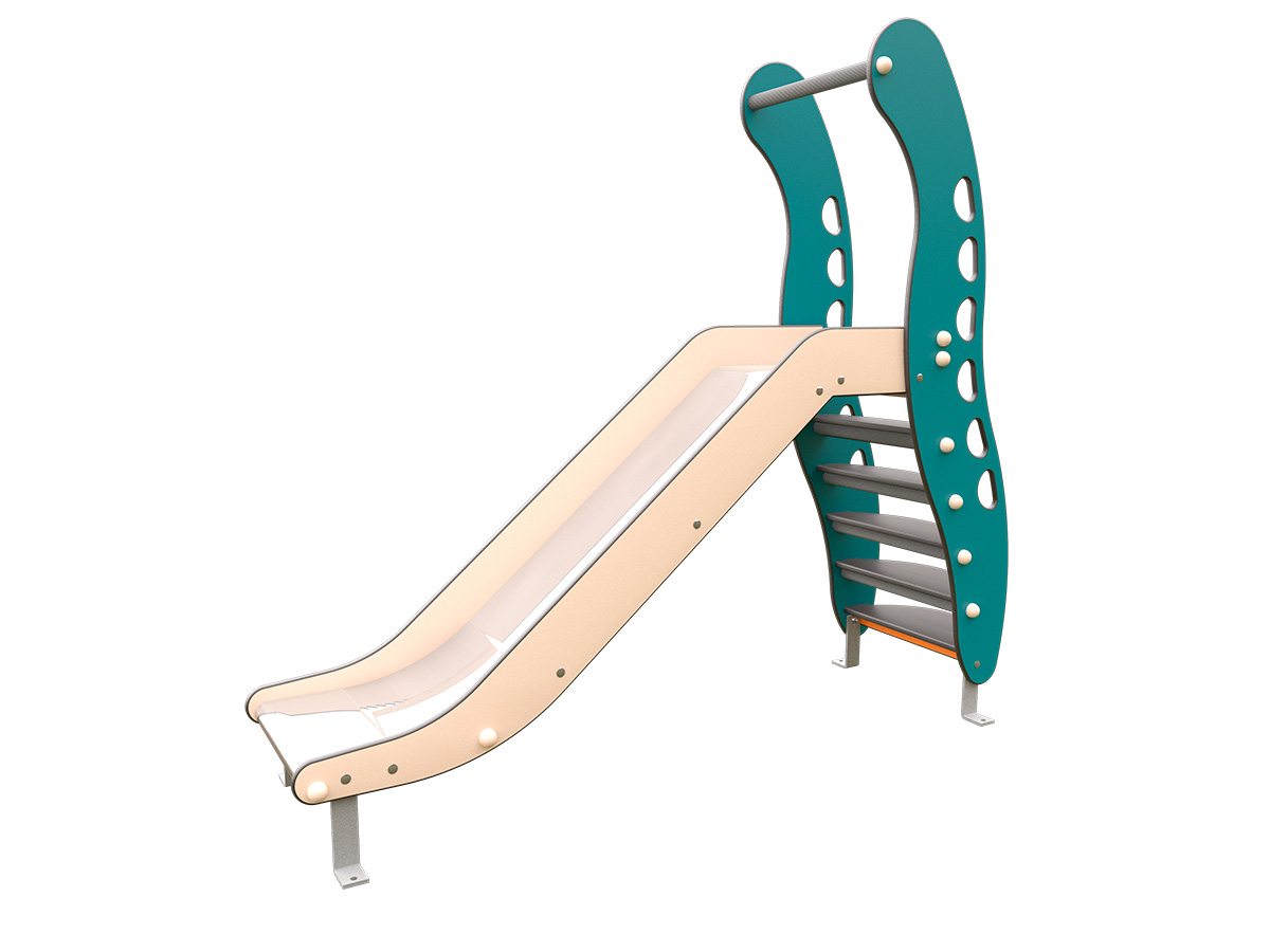 El tobogán autoportante 0,90m o JMC-490 es un elemento de juego infantil de altura media diseñado para niños de primera infancia que combina acceso mediante escalera frontal y descenso por plano inclinado. La estructura principal se compone de paneles laterales fabricados en HPL de distintos espesores, mecanizados y redondeados para garantizar seguridad y durabilidad en uso exterior. El acceso se realiza mediante peldaños de contrachapado fenólico antideslizante, dispuestos de forma progresiva y ergonómica.