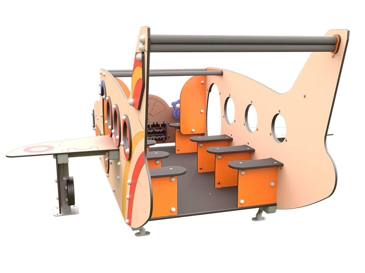 El avión o JMC-507 es un elemento de juego infantil concebido como elemento de exploración y juego simbólico de gran presencia visual. La estructura se configura mediante paneles de HPL en distintos espesores, combinados con elementos verticales y huecos circulares que refuerzan la estética aeronáutica y permiten la interacción desde el exterior. El interior dispone de una plataforma continua con pequeños asientos integrados, que facilitan el acceso y el desplazamiento dentro del módulo. Incorpora elementos lúdicos manipulativos en los paneles, como juegos de conteo y piezas giratorias, que enriquecen la experiencia de uso. El acceso se realiza a cota baja, sin desniveles, favoreciendo una entrada sencilla. Las barras superiores aportan rigidez estructural y delimitan el espacio sin cerrarlo completamente. El conjunto presenta formas suaves y transiciones redondeadas, pensadas para un uso seguro en áreas de juego infantil.