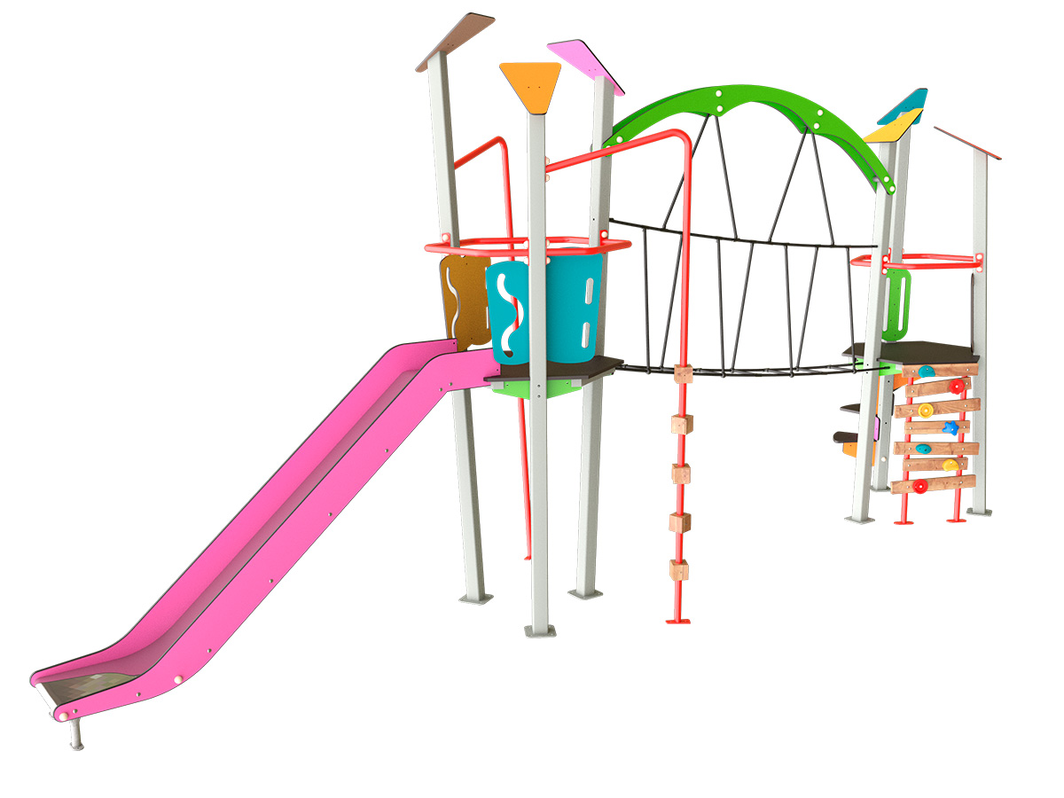 Este combinado Berlín o JMC-700-20 es un juego infantil multiactividad diseñado para niños a partir de 3 años, que combina diferentes accesos, plataformas elevadas y elementos de trepa y deslizamiento. El conjunto se estructura mediante postes verticales con pies metálicos divergentes y convergentes, que garantizan la estabilidad del conjunto y definen los distintos volúmenes del juego. Incorpora plataformas a distintas alturas conectadas mediante escaleras, paneles de trepa y un puente colgante, así como un tobogán de salida que completa el recorrido lúdico. Los paneles y plataformas están fabricados en HPL, configurando zonas de juegos diferenciadas y favoreciendo un uso dinámico del espacio. El diseño fomenta el movimiento continuo y la exploración activa, con una estética colorida que puede adaptarse según las preferencias del cliente.