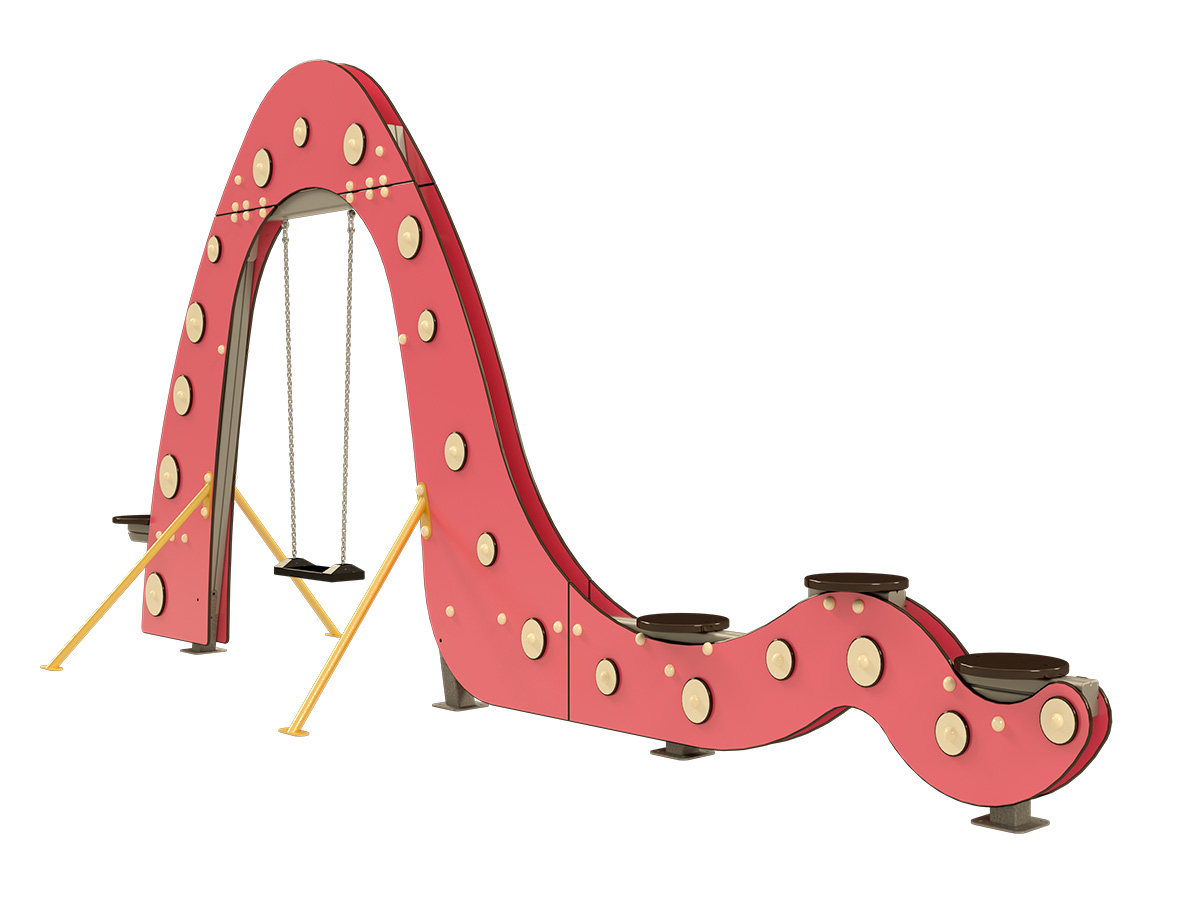 Este compacto Columpio – Pulpo o JMC-800-42 es un juego infantil compuesto por un columpio integrado en una estructura de paso y equilibrio. El conjunto se configura mediante un gran arco lateral que soporta el sistema de suspensión del columpio, complementado por una secuencia de plataformas circulares a distintas alturas que conforman un recorrido ondulante a ras del suelo.