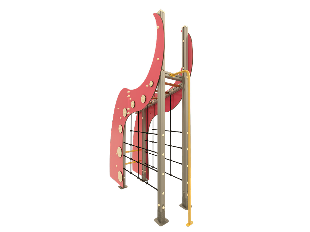 Este compacto Escalada brazos – Pulpo o JMC-800-44 es un juego infantil diseñado como recorrido de escalada y desplazamiento suspendido, formado por dos paneles laterales verticales que integran redes de cuerda y un sistema superior de tubos para progresión mediante agarre de brazos. El conjunto se apoya sobre pies de madera y largueros estructurales que garantizan estabilidad y resistencia durante el uso.