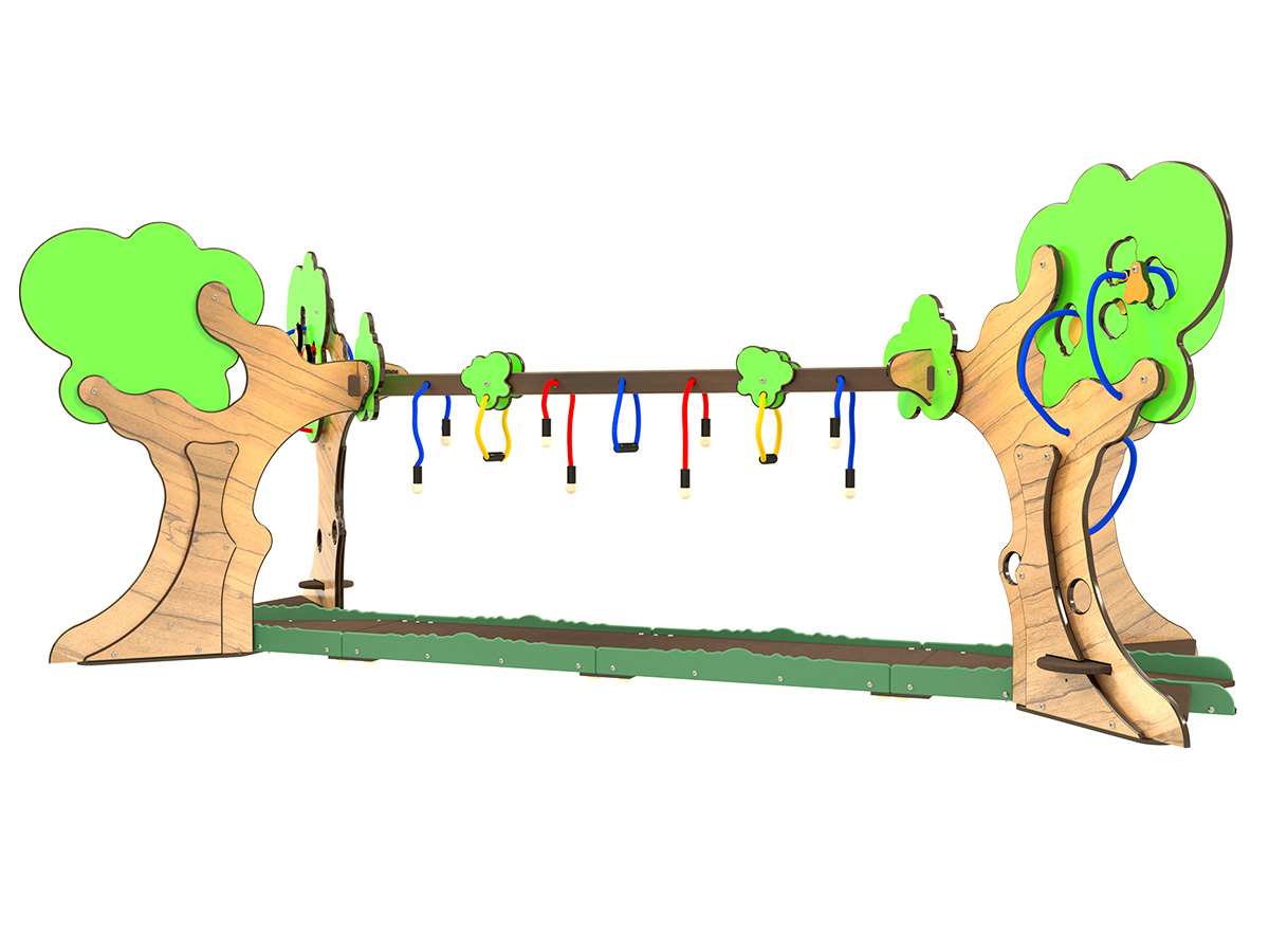 Conjunto Mini arboleda o JMC-900-16 que dispone de una estructura motriz formada por un recorrido lineal a nivel del suelo, delimitado por dos grandes paneles laterales en HPL con acabado efecto madera que representan árboles. Ambos extremos están unidos por una barra superior de la que cuelgan diferentes presas móviles y asas de cuerda, diseñados para favorecer el agarre y la manipulación. El camino inferior está compuesto por plataformas de contrachapado fenólico antideslizante, enmarcadas por bordes de HDPE de 19mm, que mantienen el recorrido seguro y bien delimitado.