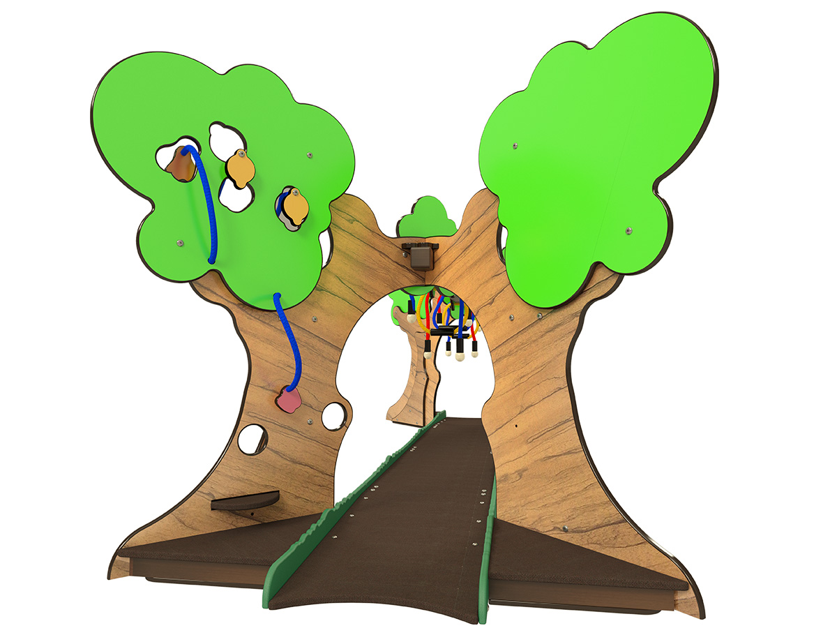 El diseño a nivel de suelo permite que puedan participar niños con diferentes niveles de autonomía, facilitando acciones como avanzar, agacharse, estirarse o manipular, todo dentro de un entorno protegido. La temática de árboles favorece el juego imaginativo, y las actividades laterales añaden oportunidades de descubrimiento y diálogo entre iguales, reforzando la socialización y el aprendizaje compartido.