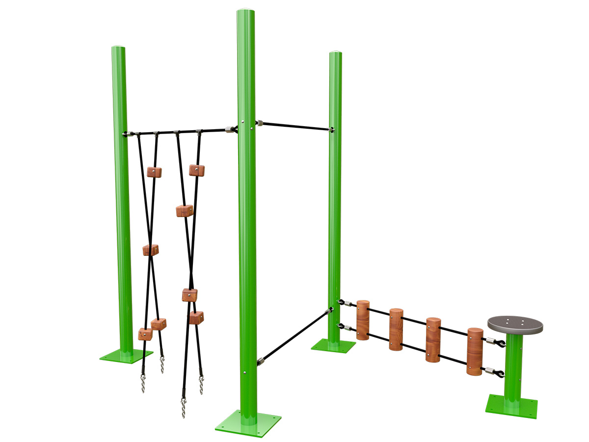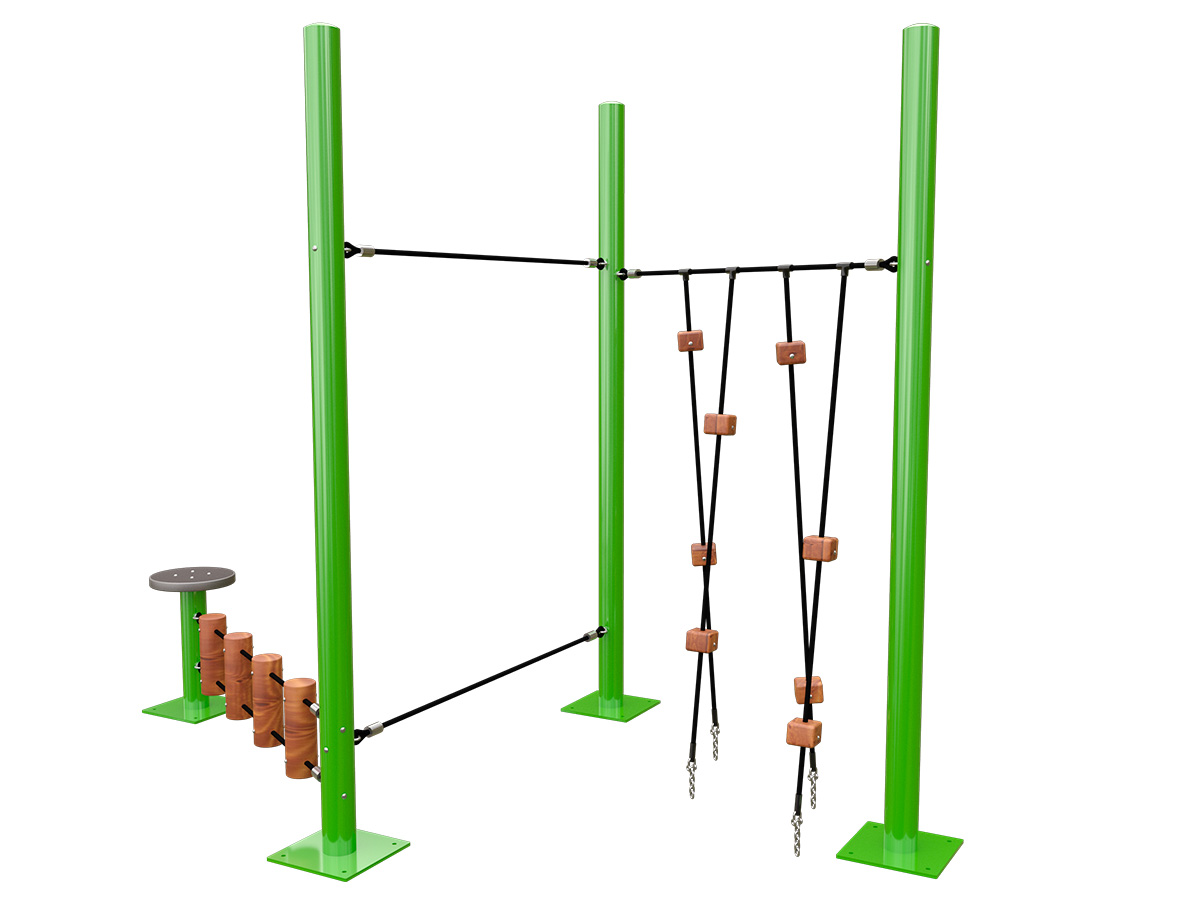 Este juego potencia el desarrollo de la motricidad global al exigir control del equilibrio, coordinación óculo-motora y precisión en los apoyos. La variedad de superficies – cuerdas, bloques y cilindros – fomenta la planificación del movimiento y la percepción espacial, mientras que el desplazamiento en equilibrio favorece la concentración y la autoconfianza. Al tratarse de un recorrido continuo, también promueve la interacción social, la cooperación y la toma de turnos entre los usuarios.