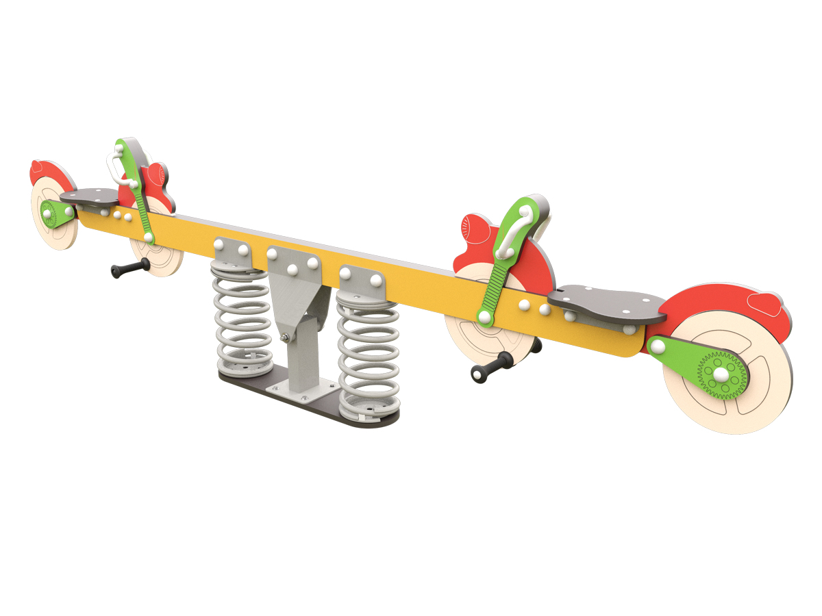 El juego estimula la coordinación bilateral, el equilibrio dinámico y la conciencia corporal, al requerir que los niños sincronicen sus movimientos para mantener el ritmo del balanceo. Este tipo de juego también promueve la cooperación y la empatía, ya que la diversión depende de la colaboración entre ambos usuarios. El diseño temático en forma de motocicleta despierta la imaginación y el juego simbólico, fomentando la creatividad y las habilidades sociales a través de la representación de roles. Gracias al movimiento de vaivén, el balancín contribuye al desarrollo del sistema vestibular, ayudando a mejorar la percepción del equilibrio y la orientación espacial de manera lúdica.