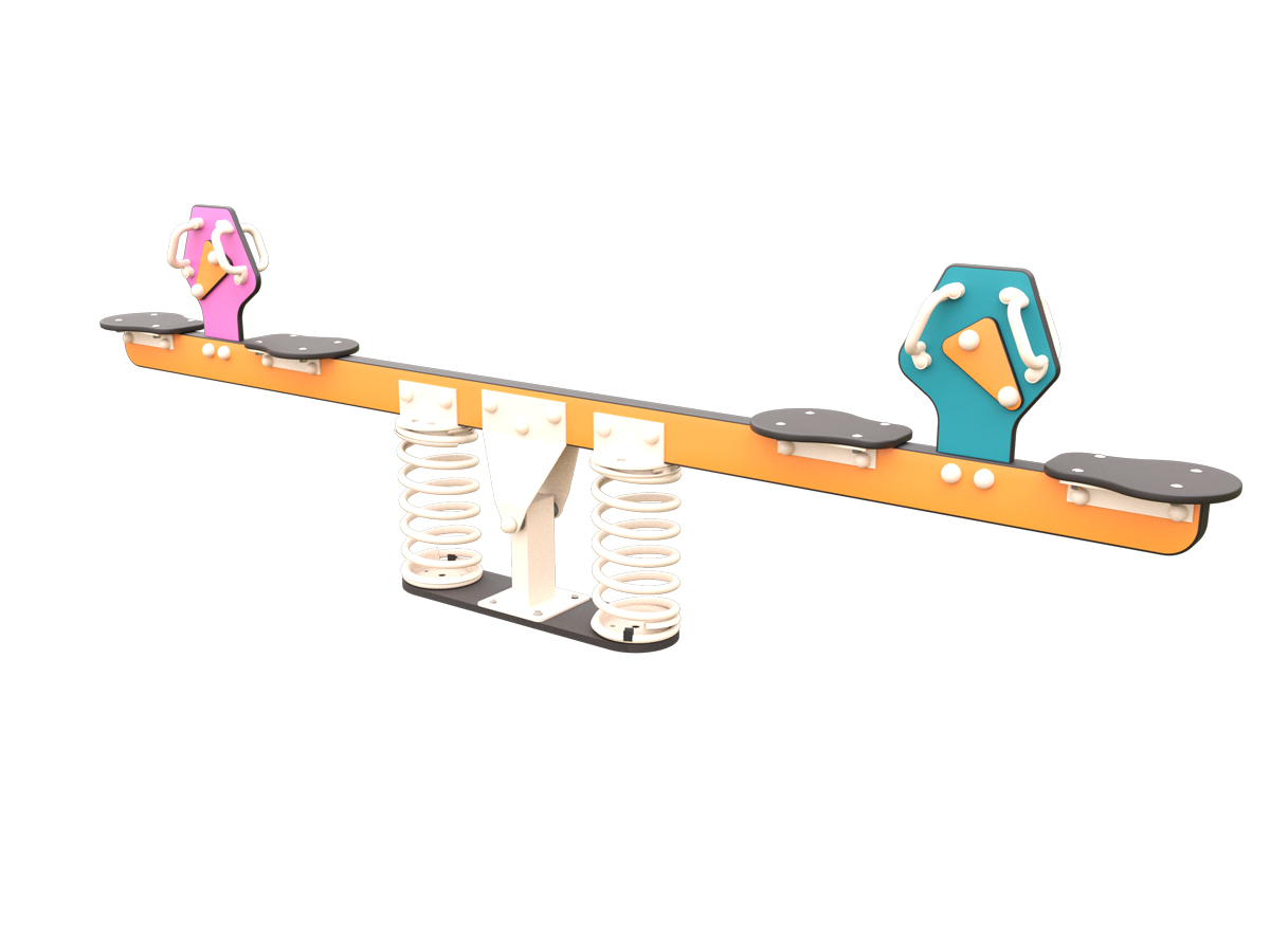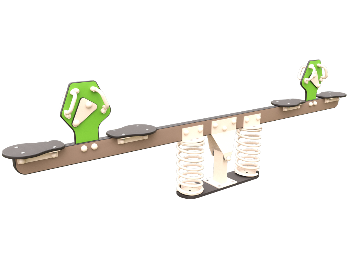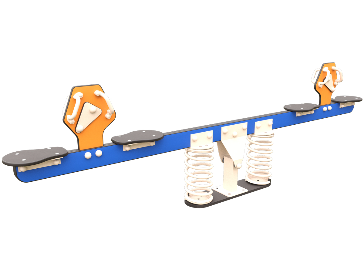 Nuestro balancín de muelles 4 plazas CIO o MC-312 combina diseño y confort para el juego en pareja. La estructura principal está fabricada en acero con recubrimiento para exteriores, garantizando una excelente resistencia frente a la corrosión y al uso intensivo. El travesaño central es de HPL, un material duradero y resistente a la intemperie que mantiene el color y la estabilidad estructural a lo largo del tiempo. Su sistema de amortiguación mediante dos muelles de acero situados bajo la zona central proporciona un movimiento más suave y progresivo, reduciendo los impactos durante el balanceo. Los asientos amplios y antideslizantes, junto con los asideros ergonómicos a la altura de las manos, ofrecen una sujeción segura y cómoda.