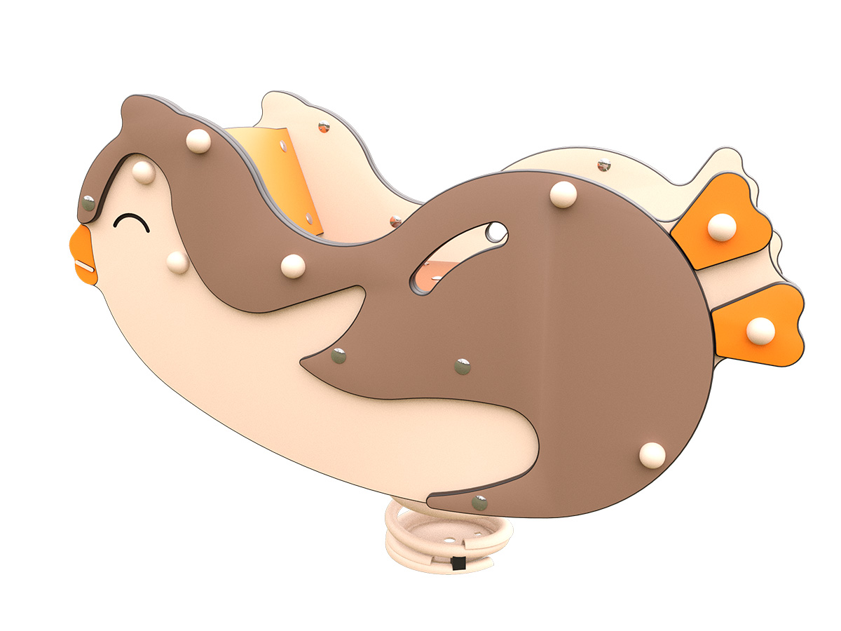 El conjunto se articula mediante un muelle central metálico anclado en el terreno, que permite un movimiento oscilante suave en varias direcciones. La estética temática puede adaptarse en colores según las preferencias del cliente, manteniendo la misma base constructiva y funcional.