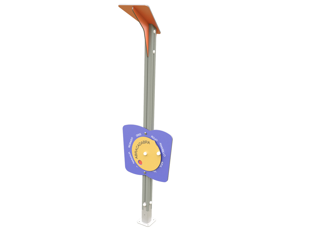 El abracadabra o PLI-03 es un panel lúdico de integración compuesto por un poste vertical y un conjunto frontal formado por dos paneles superpuestos. El panel posterior permanece fijo, mientras que el panel frontal es giratorio y puede accionarse manualmente sobre su eje central. El elemento móvil incorpora aperturas y marcadores gráficos visibles durante el giro, generando cambios visuales controlados a medida que se rota el panel. El conjunto se instala a una altura accesible y dispone de espacio libre inferior, permitiendo su uso frontal por parte de usuarios de distintas estaturas y desde silla de ruedas. La estructura se apoya sobre un poste vertical que puede ser de madera o metálico, garantizando estabilidad y durabilidad en exteriores.