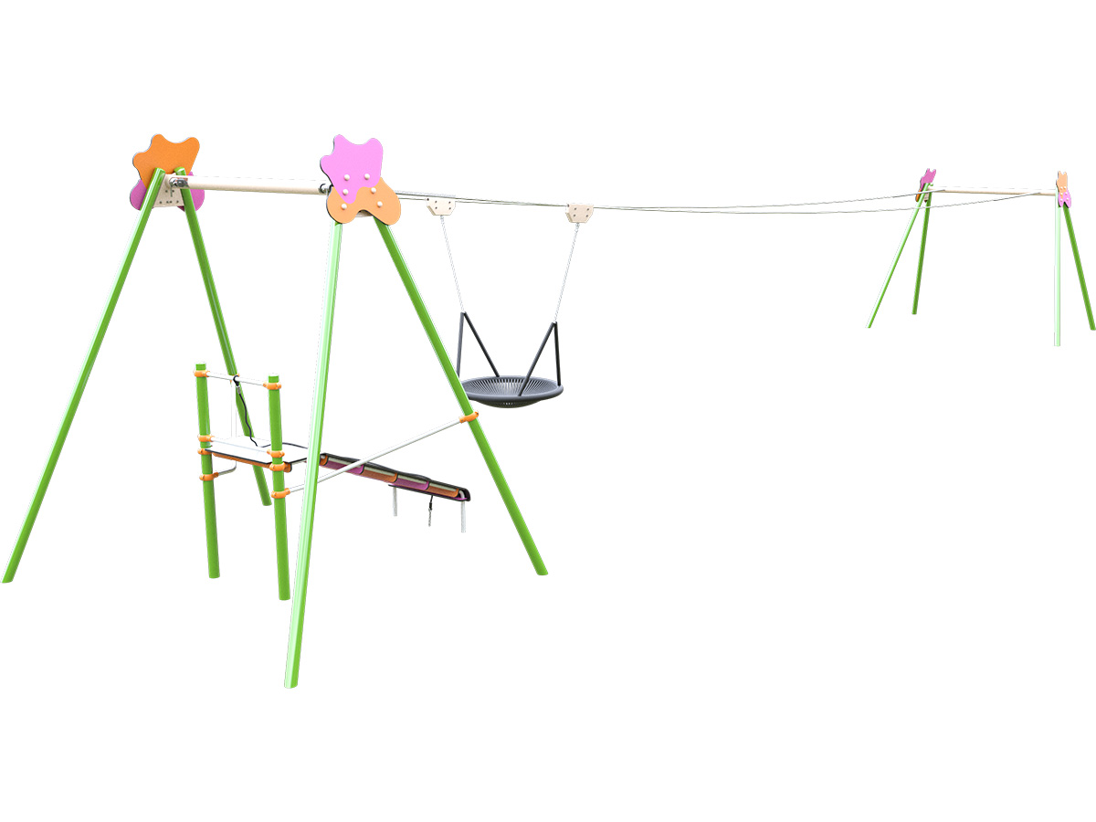 Este elemento fomenta la experimentación del movimiento, la percepción del equilibrio y la orientación espacial a través de una experiencia dinámica y controlada. El recorrido en tirolina estimula la confianza corporal y la superación progresiva de retos, favoreciendo el desarrollo de la coordinación y la conciencia del propio cuerpo en movimiento. El uso del asiento tipo nido permite una vivencia compartida del juego, ya sea mediante acompañamiento, apoyo previo o interacción social antes y después del recorrido, reforzando la comunicación y la integración en el entorno de juego.