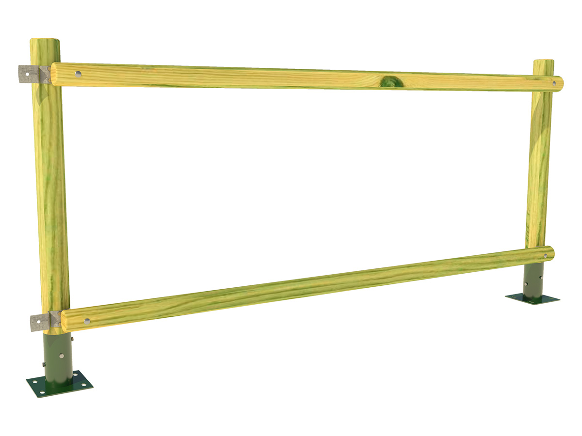 Fabricada en madera de conífera torneada con tratamiento para exteriores, esta valla ofrece una elevada resistencia frente a la intemperie y al uso continuado en espacios públicos. Su diseño incorpora pies de Ø100 mm y largueros de Ø80 mm, unidos mediante herrajes metálicos tipo tejano galvanizados, que aportan una gran estabilidad estructural y un acabado característico de estilo rural.