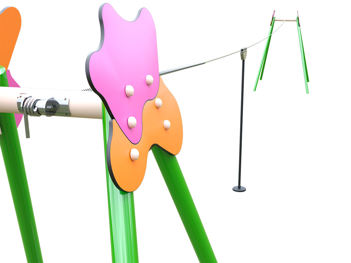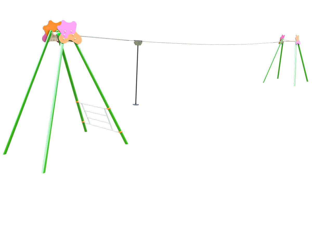 Tirolina infantil diseñada para el desplazamiento suspendido a lo largo de un recorrido lineal, mediante deslizamiento controlado a baja altura. La estructura se compone de postes inclinados que sostienen un cable de acero tensado, sobre el que se desplaza el sistema de rodadura. Incorpora un asiento suspendido que permite al niño realizar el recorrido sentado, manteniendo una posición estable durante el trayecto.